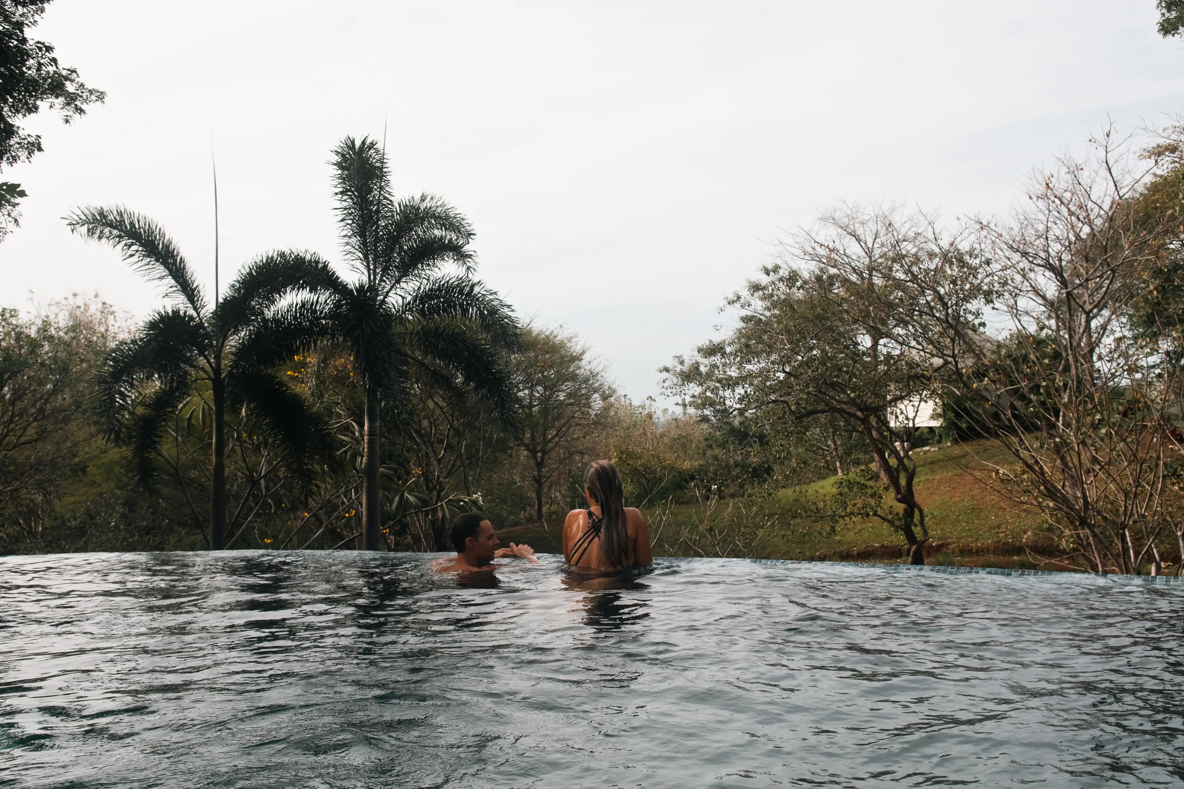 Relax in our stunning infinity pool overlooking the jungle canopy, or unwind in the private jacuzzi under a traditional palm-roof rancho. The sound of water flowing from the edge, the breeze on your skin, and the fragrance of tropical plants complete the experience.