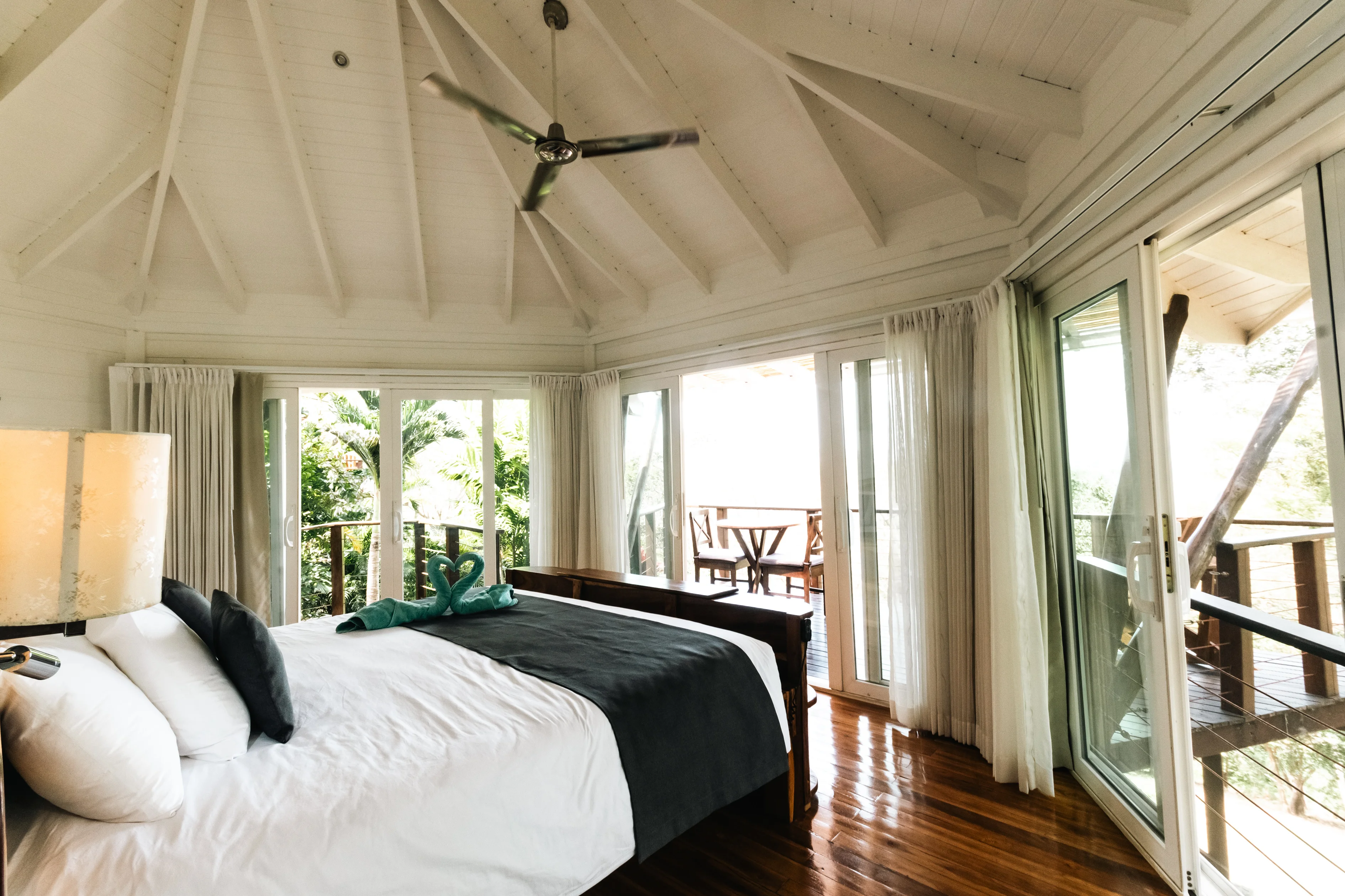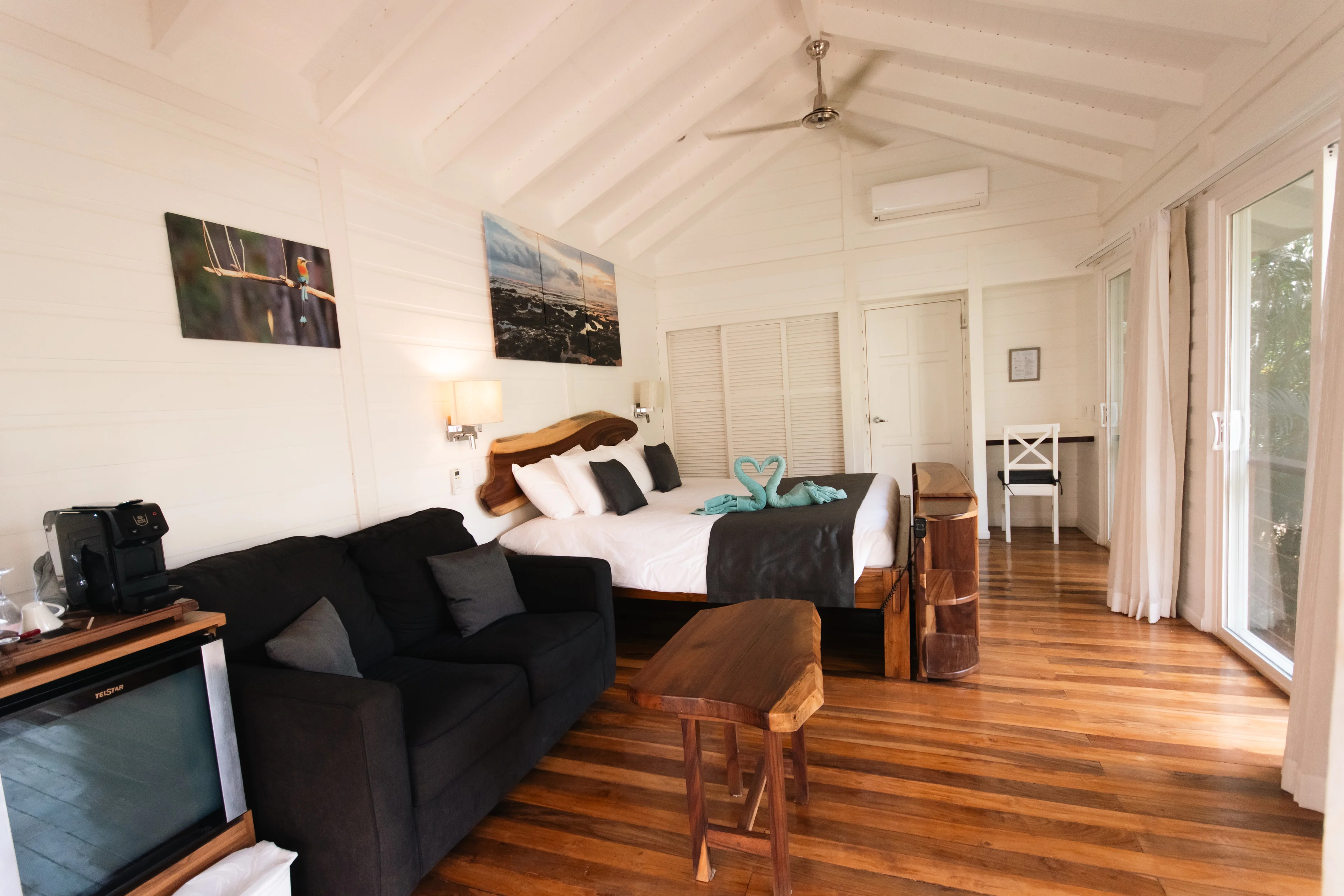Six independent bungalows on 7.5 hectares of jungle. Each features a king bed, retractable flat-screen TV, Britt Espresso machine, mini-bar, safe, and a spacious terrace with sliding windows opening onto the rainforest.